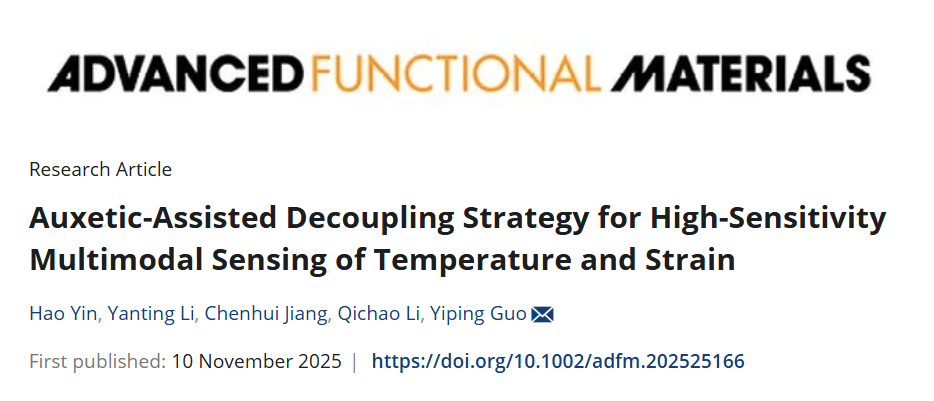 近日,av直播-av线上-线上av 金属基复合材料全国重点实验室郭益平教授课题组在柔性压电传感领域再获重要进展。其最新研究成果以 “Auxetic-Assisted Decoupling Strategy for High-Sensitivity Multimodal Sensing of Temperature and Strain” 为题,正式发表于国际著名材料期刊《Advanced Functional Materials》(DOI: //doi.org/10.1002/adfm.202525166)。